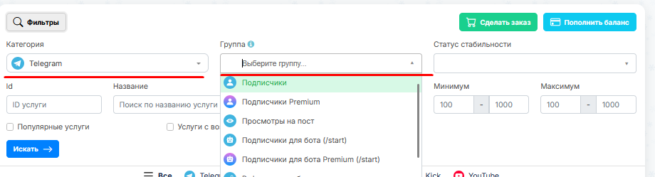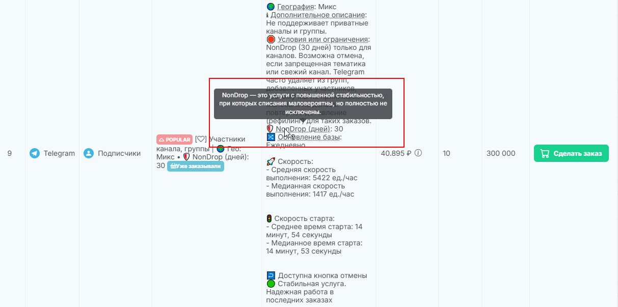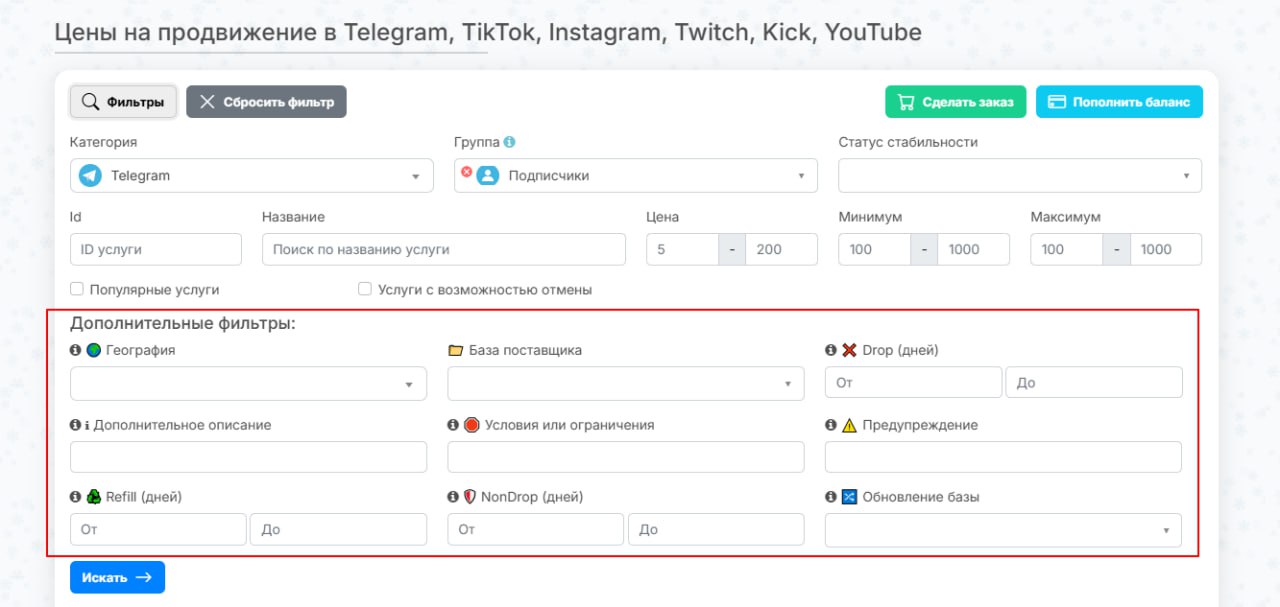 Вы можете искать услуги не только по названию, но и по конкретным характеристикам. Например, выбрать подходящую географию аудитории, срок рефилла или условия нон-дропа — всё это доступно в одном месте.