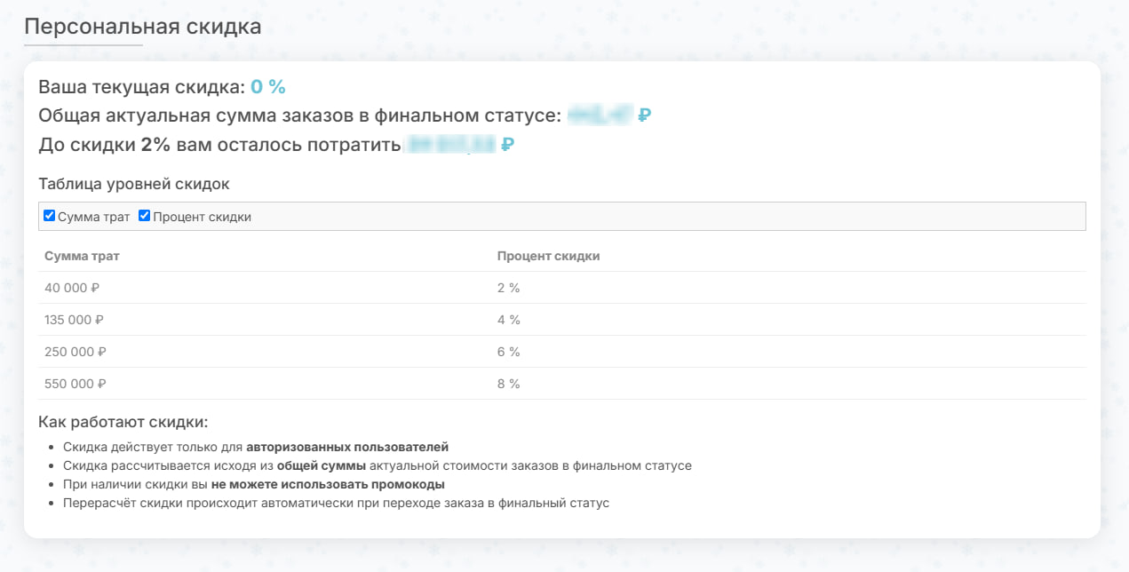 Там можно увидеть детальную информацию: текущий уровень, общую сумму завершенных заказов, таблицу уровней, сумму до повышения и условия действия скидки.